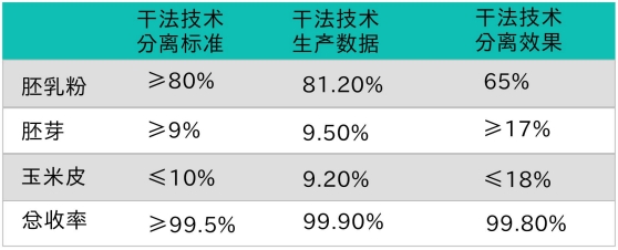 工藝優勢1.高效的分離效果:隨著設備創新和光電自控水平的提高,通過先進的工藝過程,成功高效分離出脫脂玉米粉、胚芽、玉米皮,分離效果好于濕法;