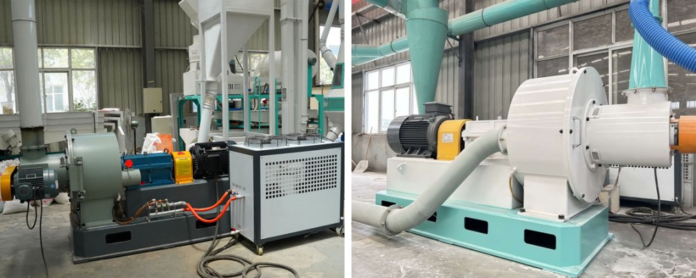 該磨粉機由冰水空氣壓縮機、勻料器、合金翻刀盤、雙層研磨室、粉度葉輪、智能粉體加濕器、智能自動加油機、軸承室、風機、脈沖、沙克龍、關風器、集成電控系統等組成。